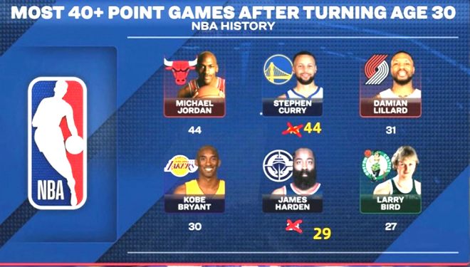 库里复出后,真的是累瘫了,上一场砍下46分帮助球队取胜,今天又是在进攻端大包大揽,26中16,3分17中9,罚球8中8,得到49分4篮板,是球队赢球的头号功臣,真的是以一人之力帮助球队取胜。两场合砍91分!这是这个岁数应该能干出来的事吗?可他是库里啊。有趣的是,今天哈登也拿下41分14板11助,两个09双雄在30岁后的40+次数各加1场,库里追平了乔丹,哈登距离科比还差1场!此外,数据统计显示,此役是库里职业生涯第23场在罚球不到10个的情况下砍下45+比赛,排名历史第一,第二三名之和只有22场(乔丹12场,乔治·格文10场)。此外,库里连续2场砍下46+,成为历史达此成就最老的球员。